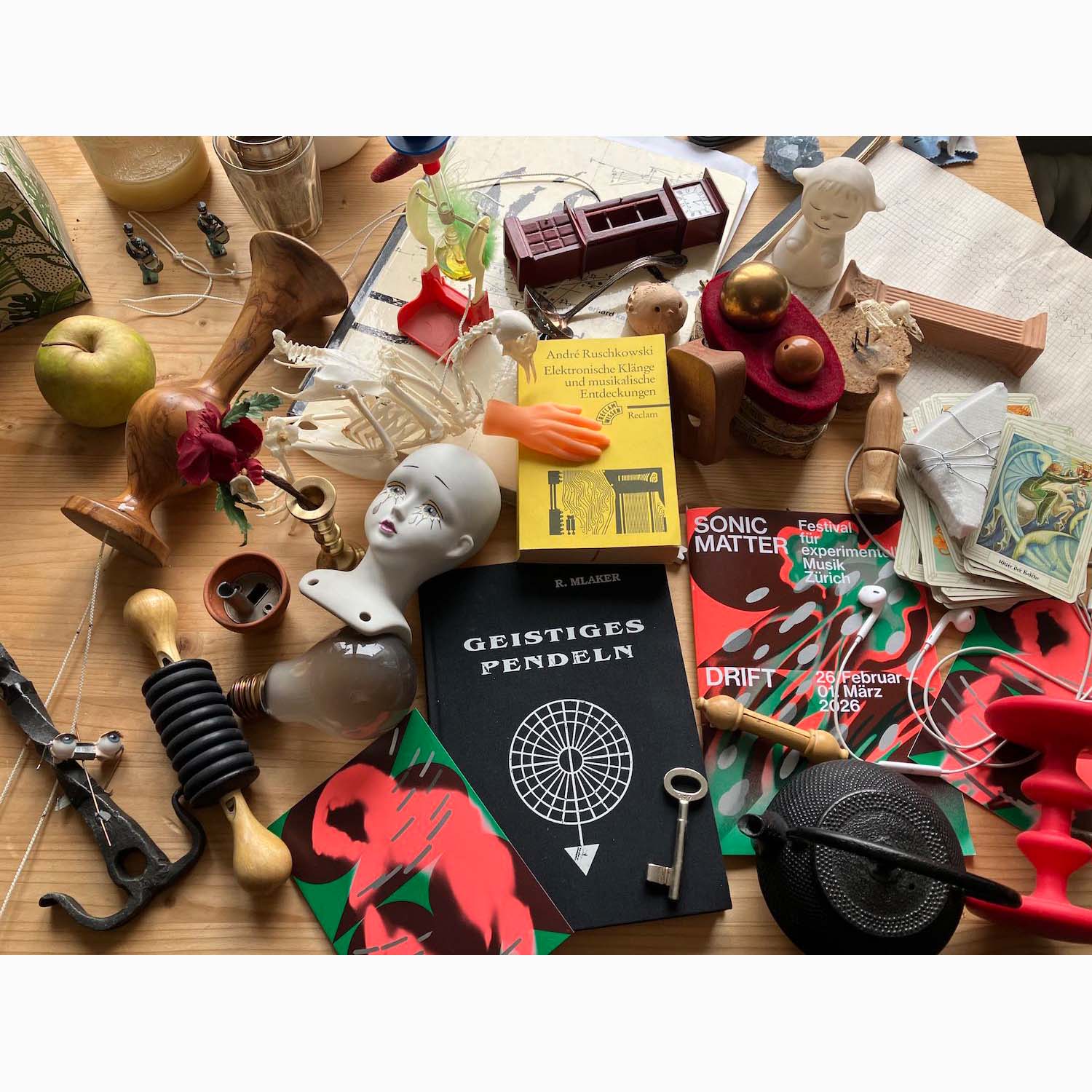 Altar of Lost Things is a kinetic 5-channel sound installation made up of small motors, found objects, organic remains (skeletons, plant remains, dead beetles), discarded electronic components, and sensors. The work is based on a fascination with the interplay of objects, movements, and sounds. It is a collaboration with Maximilian Kriegleder. Consisting of five altars on which objects are suspended as swinging pendulums, the installation creates changing rhythmic patterns and soundscapes.